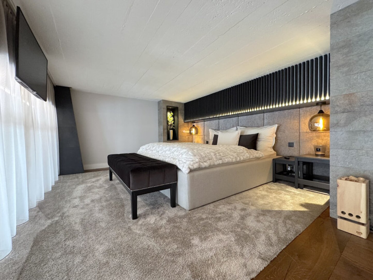 Schlafbereich: Auf der Galerie befindet sich das eingebaute Wohlfühl-Schlafzimmer samt TV, Lichtkonzept und Blick auf die untere Wohnebene – ein wundervoller Erholungsbereich. Zusätzlich gibt es einen Schrank und einen praktischen Abstellraum.