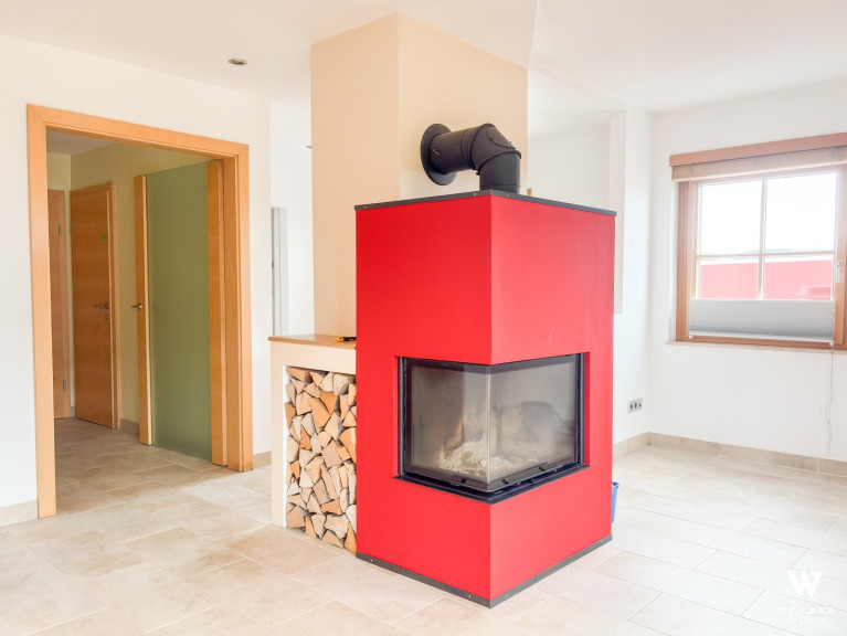 Technisch überzeugt das Haus mit einer Luftwärmepumpe, Fußbodenheizung, kontrollierter Wohnraumlüftung, Photovoltaik und Solarthermie. Ein 1000-Liter-Pufferspeicher sorgt für effiziente Wärmeverteilung, ergänzt durch einen Holzofen mit Wärmetauscher.