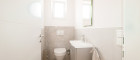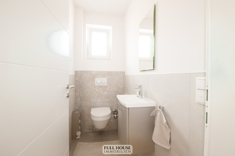 Links vom Eingangsbereich befindet sich das separate WC und überzeugt durch eine moderne Ausstattung. Hochwertige Sanitäreinrichtungen und stilvolle Fliesen sorgen für ein zeitgemäßes und harmonisches Gesamtbild.