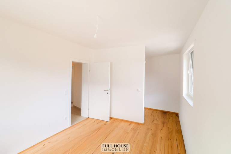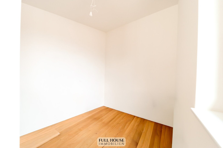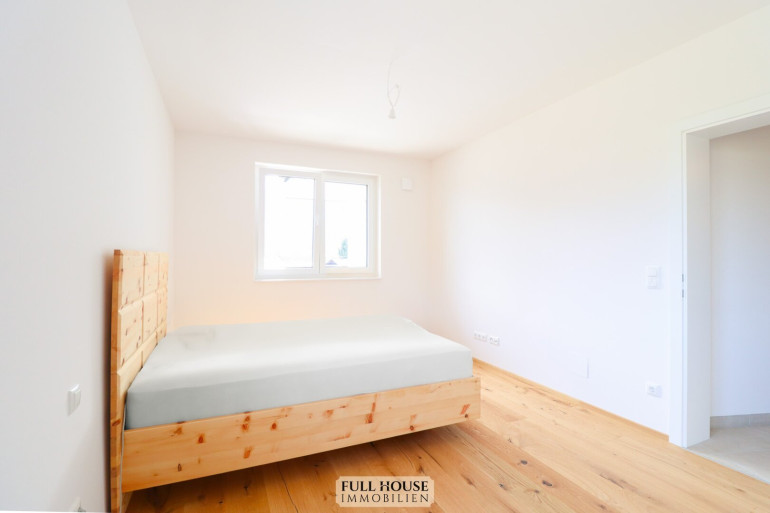 Geradeaus befindet sich ein großzügiges Schlafzimmer mit eigener, separater Garderobe. Der Raum überzeugt durch angenehme Ruhe, viel Tageslicht und ein besonders angenehmes Raumklima, das optimale Voraussetzungen für erholsamen Schlaf schafft.