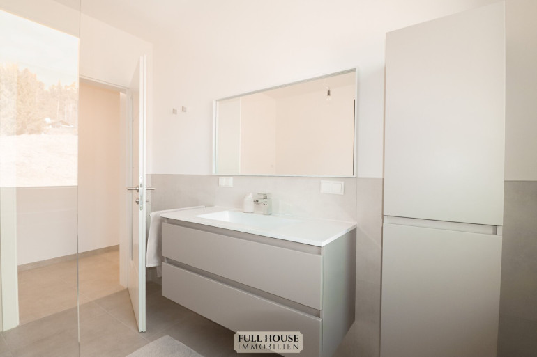 Auf der linken Seite befindet sich das großzügig gestaltete Badezimmer mit Fenster und überzeugt durch seine moderne Ausstattung, hochwertige Materialien und eine durchdachte Raumaufteilung. Die stilvolle Gestaltung schafft eine angenehme Wohlfühlatmosphäre und verbindet Funktionalität mit elegantem Design.