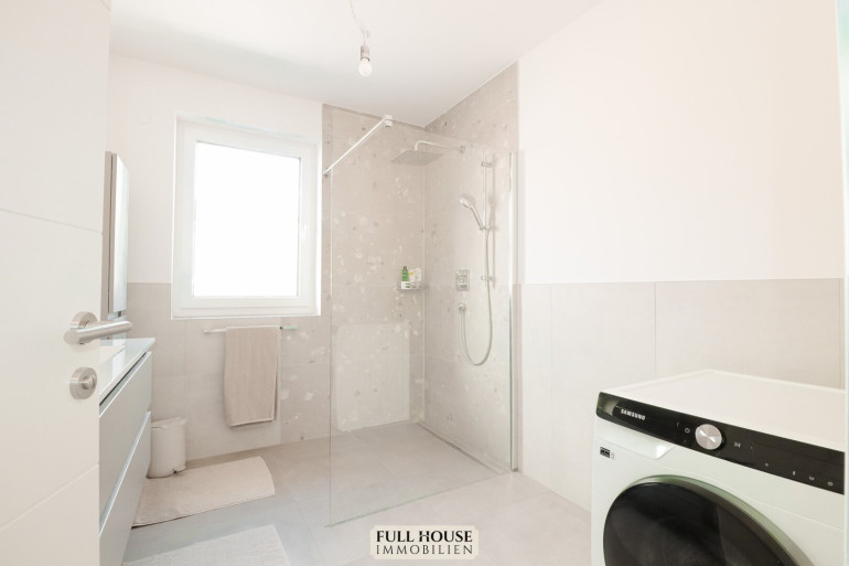 Auf der linken Seite befindet sich das großzügig gestaltete Badezimmer mit Fenster und überzeugt durch seine moderne Ausstattung, hochwertige Materialien und eine durchdachte Raumaufteilung. Die stilvolle Gestaltung schafft eine angenehme Wohlfühlatmosphäre und verbindet Funktionalität mit elegantem Design.