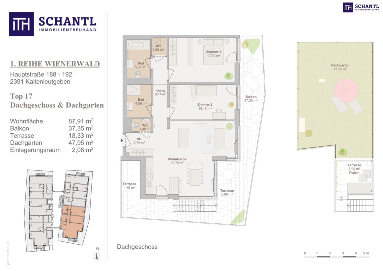 Wohnfläche: ca. 87,91m² + Balkon: ca. 37,35m² + Terrasse: ca. 18,33m² + Dachgarten: ca. 47,95m² + Kellerabteil: ca. 2,08m²