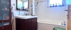 Badezimmer mit Fenster - Zur Ausstattung zählen ein Waschtisch mit Unterschrank, ein Wandspiegel, eine Badewanne mit Hand- und Regendusche sowie ein Handtuchhalter. Des Weiteren findet sich in diesem Raum auch noch Platz für einen einen Badezimmerschrank und einen Hocker.