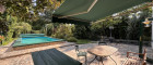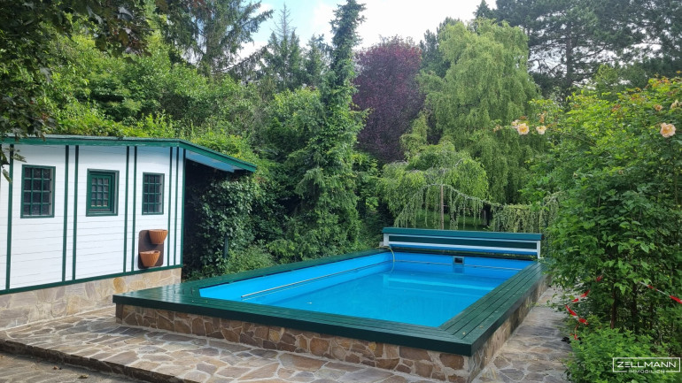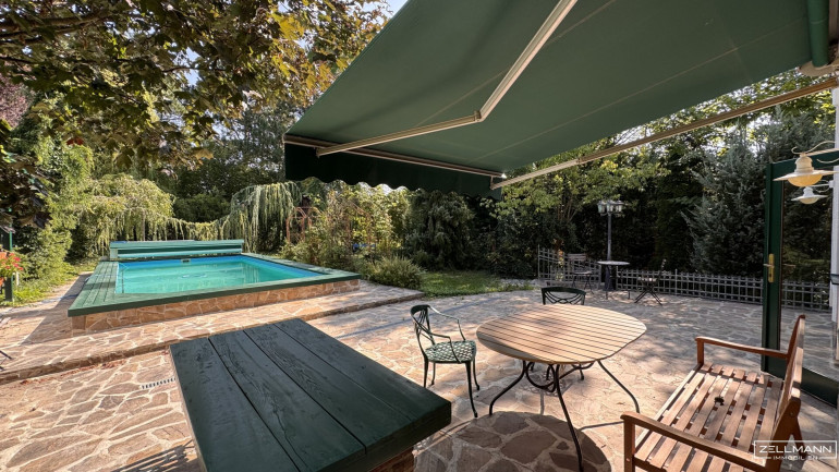 Der Swimmingpool fügt sich harmonisch in die Gartenanlage ein und erweitert den Wohnbereich ins Freie. Ergänzt wird das Ensemble durch ein Gartenhaus mit vielseitigen Nutzungsmöglichkeiten.
