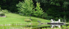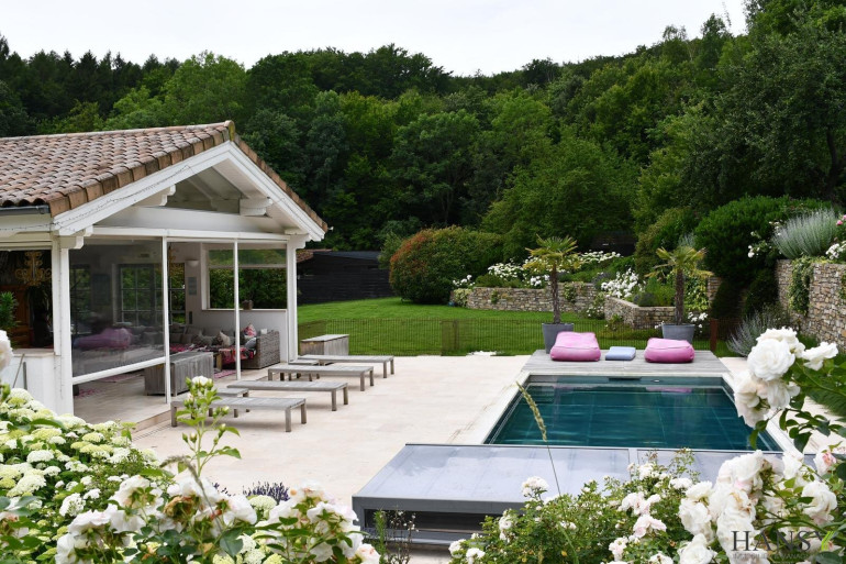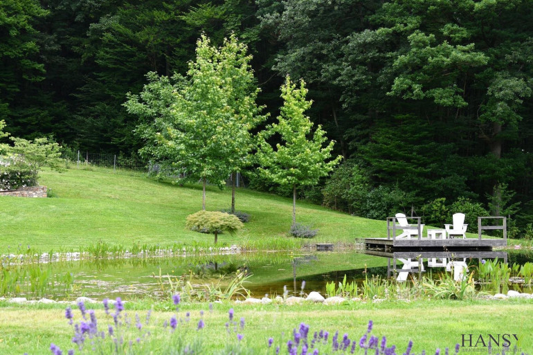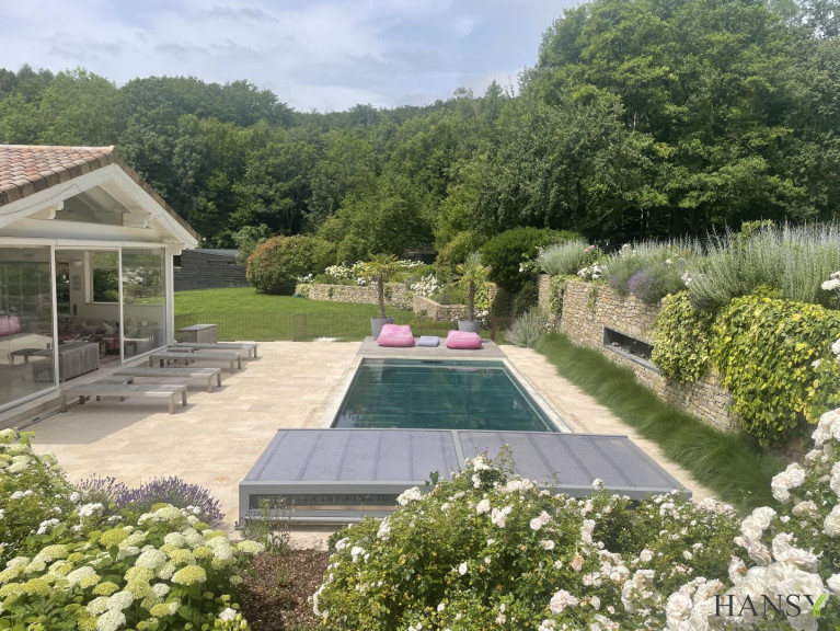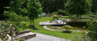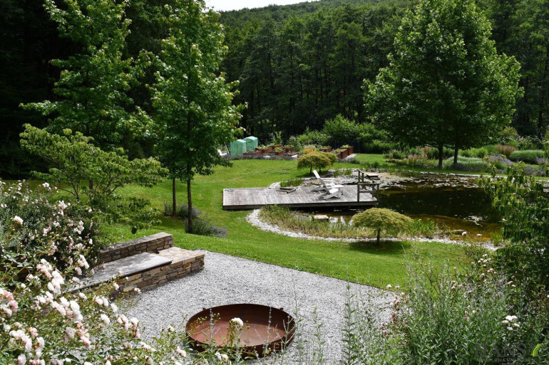 Die Gartenanlage wurde von einem renovierten Gartengestalter geplant und angelegt. Handgefertigte Natursteinmauern vermitteln ein mediterranes Gefühl. Ein großer Naturteich (über 600m² und bis 3m Tiefe) mit Steg ist der Mittelpunkt. Neben einem Edelstahl-Outdoorpool gibt es weiters einen hochwertigen Whirlpool für 4 Personen, einen Boccia-Platz (Originalmaße mit Natursteinbanden), sowie 15 Corten-Stahl-Hochbeete, einen Grillplatz für 15 Personen, sowie weitere Sitz- und Ruheplätze. Der gesamte Garten wurde neu angelegt, der Altbaumbestand allerdings erhalten. Vor dem Haus fließt ein Bach, es gibt etliche sehr alte Bäume am Grundstück.