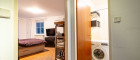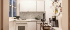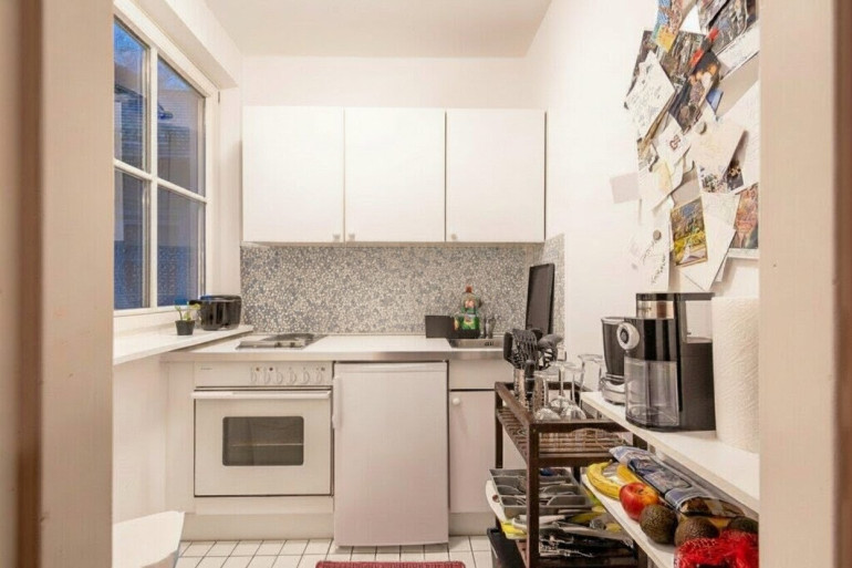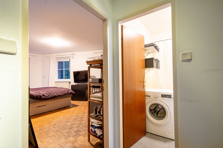 Die Küche befindet sich, mittels Holztüre abtrennbar, im Anschluss an das Wohnzimmer. Anders als in vielen anderen 1-Zimmer-Wohnungen muss also nicht im Wohnzimmer gekocht werden.