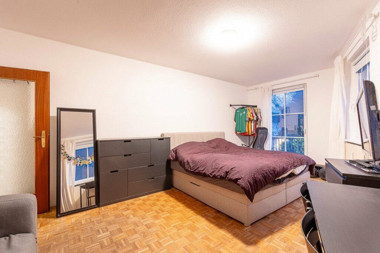 Der Wohnbereich wird durch ein Fenster, sowie eine gläserne Terrassentüre mit natürlichem Licht versorgt und wurde mit klassischem Stäbchenparkett ausgestattet.