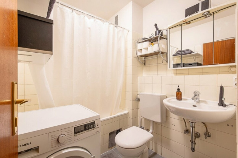 Das Badezimmer verfügt über WC/Waschbecken, einen Waschmaschinenanschluss und eine Badewanne.