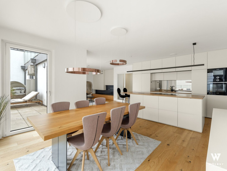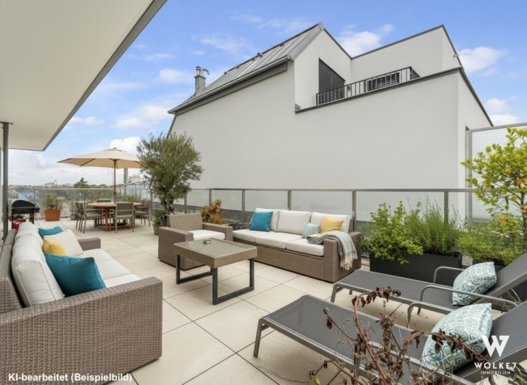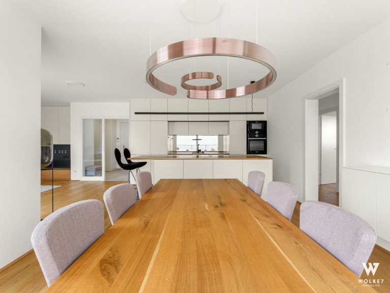In einer ruhigen Seitengasse nahe dem Kagraner Platz gelangt dieses außergewöhnlich stilvolle ca. 137,5 m² große 4-Zimmer-Dachgeschoss-Apartment im 1. Dachgeschoss eines modernen Glorit-Neubaus (Baujahr 2021) zum Verkauf. Die Wohnung überzeugt durch eine gelungene Kombination aus hochwertiger Bauqualität, durchdachtem Grundriss und exklusiver Ausstattung auf höchstem Niveau. Herzstück ist der großzügige Wohn- und Essbereich mit offenem, designorientiertem Kamin, der nicht nur optisch ein Highlight darstellt, sondern auch für eine besondere Wohnatmosphäre sorgt. Die maßgefertigte Designküche mit hochwertigen Miele-Geräten und stimmigem Lichtkonzept fügt sich perfekt in das moderne Raumgefühl ein. Insgesamt stehen drei Schlafzimmer sowie zwei stilvoll ausgestattete Badezimmer zur Verfügung, wodurch sich die Wohnung ideal für Paare, Familien oder anspruchsvolle Eigennutzer eignet. Die Ausstattung umfasst unter anderem maßgefertigte Tischlermöbel sowie exklusive Designerleuchten (Occhio & Pulpo), die dem Apartment eine elegante und individuelle Note verleihen. Für maximalen Wohnkomfort sorgt eine Kombination aus Fußbodenheizung und moderner Deckenkühlung, wodurch zu jeder Jahreszeit ein angenehmes Raumklima gewährleistet ist. Ergänzt wird dies durch eine komfortable, manuelle Steuerung von Licht, Beschattung und Temperatur.