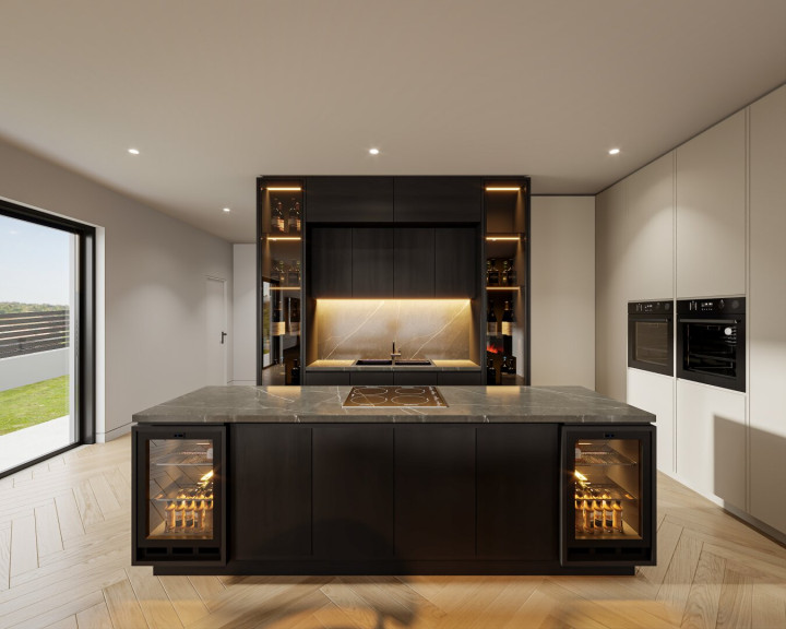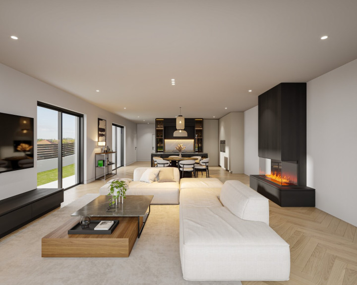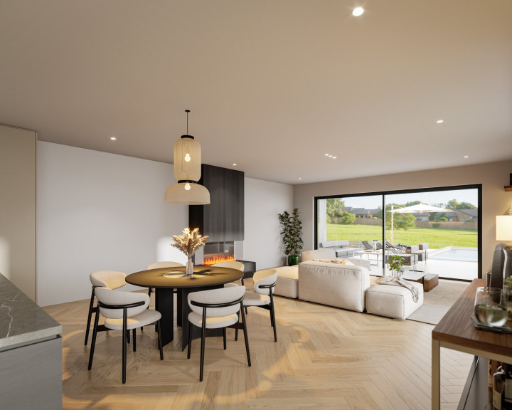 Im Wohnbereich ist ebenfalls ein Kamin vorgesehen, sodass Sie auch in der kalten Jahreszeit mit Holz heizen können – knisterndes Feuer, wohlige Wärme und gemütliche Abende inklusive. Großflächige Fensterfronten schaffen eine direkte Verbindung zur Terrasse, zum Pool und zum Garten und lassen Innen- und Außenbereich harmonisch verschmelzen.