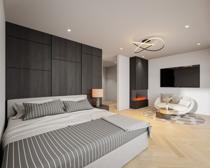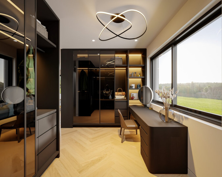 Dieses Einfamilienhaus bietet insgesamt rund 220 m² Wohnfläche, verteilt auf zwei Ebenen mit einer durchdachten und luxuriösen Raumaufteilung. Im Obergeschoss befinden sich die privaten Rückzugsbereiche. Hier erwarten Sie drei Zimmer, eines davon wurde als großzügiges Master-Schlafzimmer konzipiert. Dieses bietet nicht nur einen begehbaren Kleiderschrank, sondern auch einen Kaminanschluss, Platz für eine gemütliche Sitzecke sowie ein eigenes Badezimmer mit Dusche – ein privater Rückzugsort, der Ruhe, Stil und Geborgenheit vereint. Vom Master-Schlafzimmer aus eröffnet sich durch großflächige, bodentiefe Fenster mit Hebeschiebetür der direkte Zugang zum Balkon – mit einer herrlichen Aussicht über den Ort und in die umliegende Landschaft, die jeden Morgen aufs Neue dazu einlädt, aufzuwachen, innezuhalten und den Ausblick zu genießen.