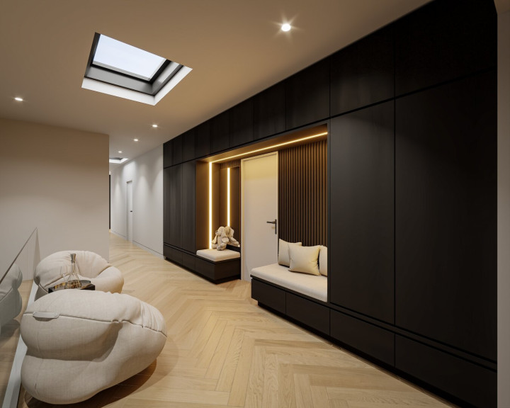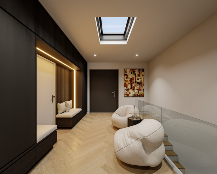 Schon beim Betreten des Hauses wird deutlich, dass hier Architektur und Eleganz aufeinandertreffen. Die Zufahrt erfolgt von oben, daher befindet sich auch der Eingang im Obergeschoss – ein architektonisches Detail, das Komfort und Privatsphäre auf elegante Weise verbindet. Der imposante Eingangsbereich mit großzügiger Pivot-Eingangstüre setzt ein starkes Statement und vermittelt sofort Exklusivität. Der Vorraum ist außergewöhnlich hell und lichtdurchflutet, unterstützt durch ein Dachflächenfenster, die den Raum mit natürlichem Tageslicht erfüllen. Der Eingangsbereich bietet viel Platz für eine Garderobe mit großzügigem Stauraum welche für Ordnung und Komfort im Alltag sorgt. Ausreichend Platz für eine kleine, elegante Sitzecke schafft Komfort – perfekt, um bequem die Schuhe anzuziehen oder entspannt zu verweilen, während man auf den Partner zur gemeinsamen Abfahrt wartet.