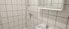 - Badezimmer: ca. 3 m², ausgestattet mit WC, Dusche, Waschbecken mit Stauraum und durchgehend gefließt.