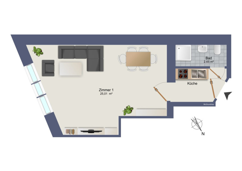 - Hauptzimmer: Über 25 m², offen und flexibel als Wohn-, Schlaf- und Essbereich nutzbar.