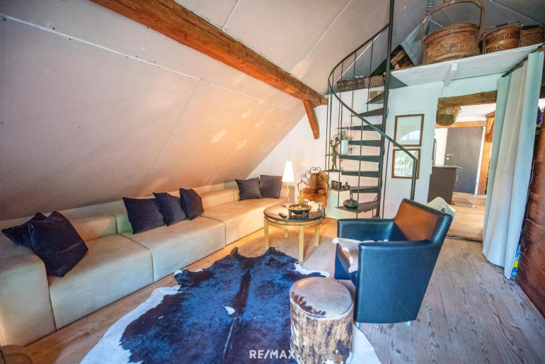 Das Obergeschoss bietet eine separate Wohneinheit. Sie wird schon bewohnt, aber diverse Fertigstellungsarbeiten sind noch von Nöten. Der direkte Zugang zum Garten, wo Sie in der Hängematte ideal relaxen und entspannen können.