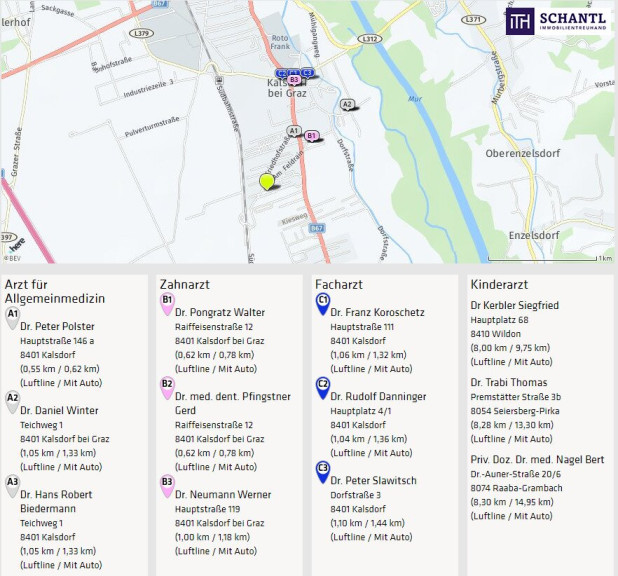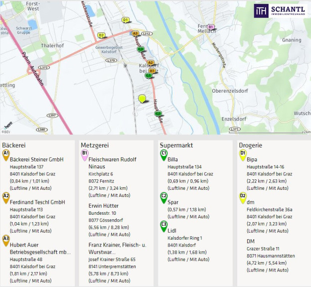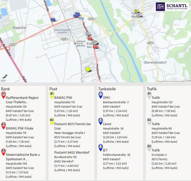 Das Objekt liegt in einer gepflegten Wohnhausanlage in der Gemeinde Kalsdorf bei Graz. Das Ortszentrum mit sämtlichen Nahversorgern, das Hallenbad Kalsdorf und der Bahnhof befinden sich in unmittelbarer Gehdistanz. Die nächste Bushaltestelle ist quasi vor der Haustüre. Die Nähe zum Schwarzl Freizeitzentrum, der Copacabana Kalsdorf, dem Flughafen Graz-Thalerhof und der Autobahn A9 bieten eine Top-Infrastruktur.