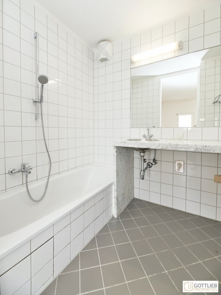 + Wannenbad mit Marmorwaschtisch und eingelassenem Waschbecken sowie Waschmaschinen-Anschluss