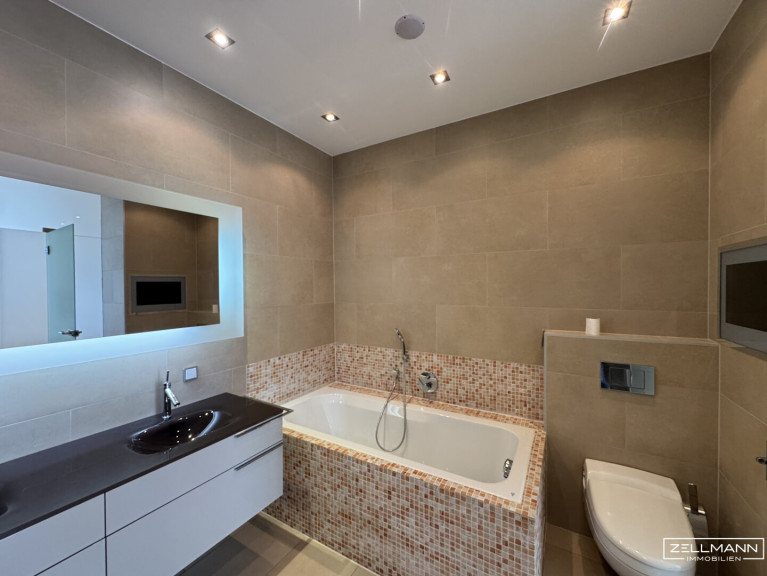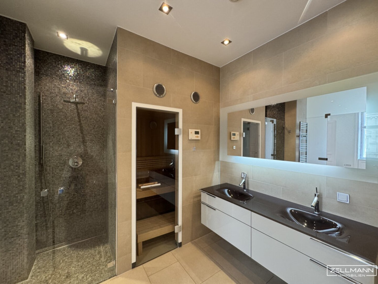 - Masterbereich mit begehbarem Schrankraum sowie luxuriösem Badezimmer inklusive Sauna und Infrarotkabine