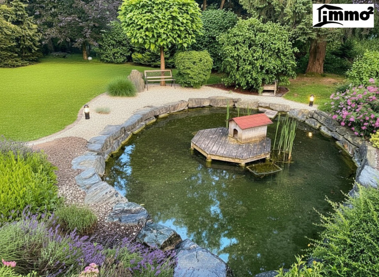 Der Außenbereich ist zweifellos eines der größten Highlights dieser Liegenschaft. Der weitläufige, parkähnliche Garten mit altem Baumbestand, liebevoll angelegten Grünflächen, einem kleinen Teich sowie einem natürlichen Bachlauf vermittelt ein Gefühl von Ruhe und Großzügigkeit.