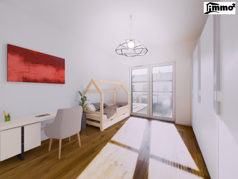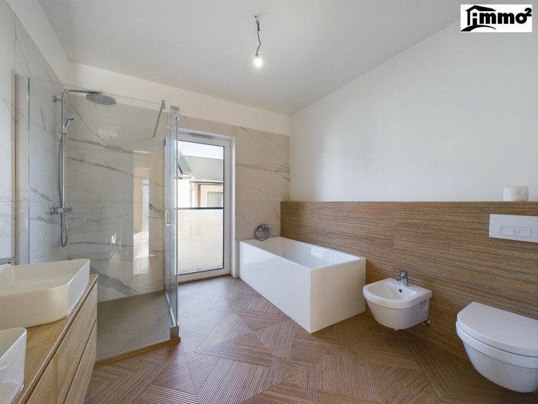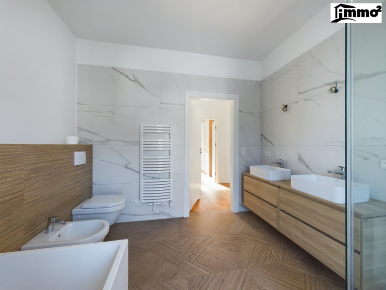 Das Obergeschoss bietet Platz für Erholung und Privatsphäre. Drei Schlafzimmer und ein begehbarer Kleiderschrank erfüllen höchste Ansprüche an Komfort. Das moderne Badezimmer mit Dusche, Badewanne, Bidet und WC wird zur Wellnessoase für die ganze Familie.