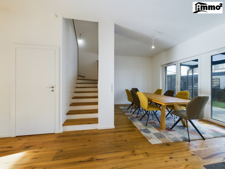 Der großzügige Wohn-Essbereich mit offener Küche ist das Herzstück des Hauses. Von hier aus gelangen Sie auf die teils überdachte Terrasse, die zu entspannten Stunden im Freien einlädt. Neben einem Gäste-WC mit Dusche finden Sie im Erdgeschoss auch einen Technikraum, einen Abstellraum sowie ein praktisches Bürozimmer.