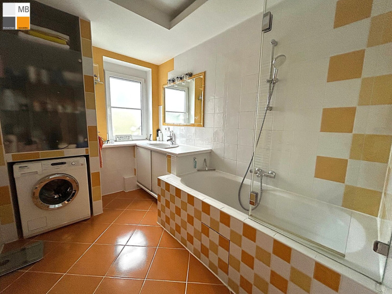 Bad mit Wanne, Duschwand, Kasten und Fenster, Handtuchtrockner