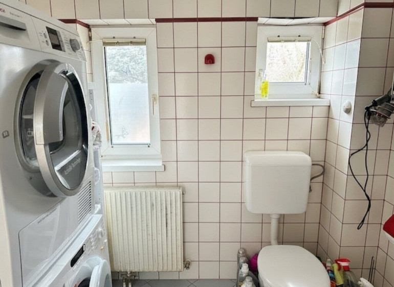 Badezimmer mit Badewanne und WC, Waschmaschine