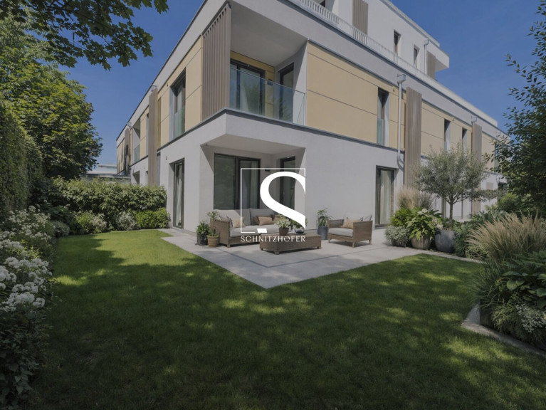 Diese stilvolle Gartenwohnung befindet sich in einem modernen Neubau und überzeugt durch hochwertige Ausstattung, durchdachte Grundrisse und eine attraktive Süd-Ost-Ausrichtung. Bereits beim Betreten empfängt Sie ein einladender Eingangsbereich mit ausreichend Platz für eine Garderobe. Ein zentraler Gang trennt den privaten Schlafbereich klar vom offenen Wohn- und Essbereich. Die Wohnung verfügt über zwei Schlafzimmer, eines davon mit praktischem Ankleidebereich. Beide Zimmer bieten direkten Zugang in den Garten und schaffen so eine besonders angenehme Wohnatmosphäre. Das Badezimmer ist modern gestaltet und mit WC sowie einer ebenerdigen Dusche mit Glastrennwand ausgestattet. Ergänzend steht ein separates Gäste-WC zur Verfügung. Das Herzstück der Wohnung bildet der großzügige, knapp 30 m² große Wohn- und Essbereich mit südlicher Ausrichtung. Große Glasflächen sorgen für viel Tageslicht und schaffen eine harmonische Verbindung zum Außenbereich. Von hier aus gelangen Sie direkt auf die überdachte Terrasse sowie in den eigenen Garten. Ein praktischer Abstellraum sowie die vorbereiteten Anschlüsse für die Küche runden diesen Bereich ideal ab.