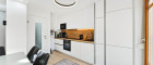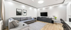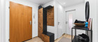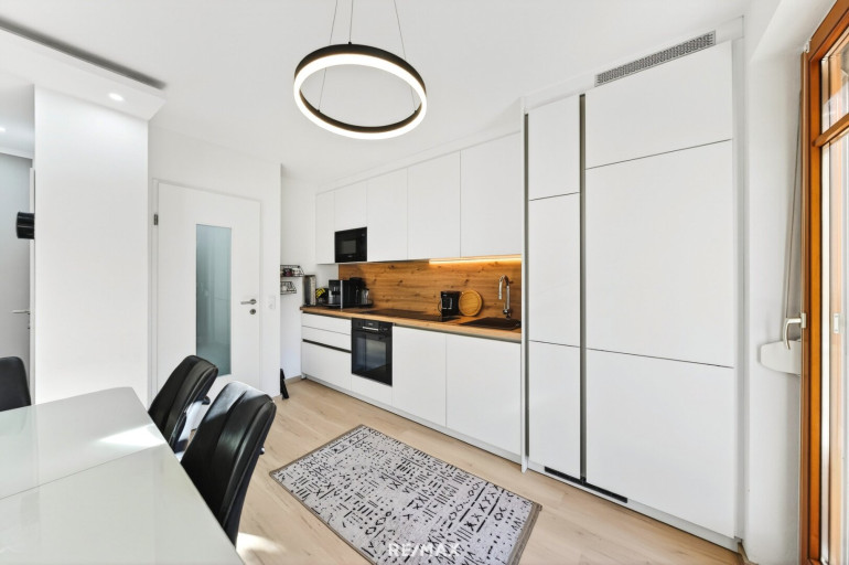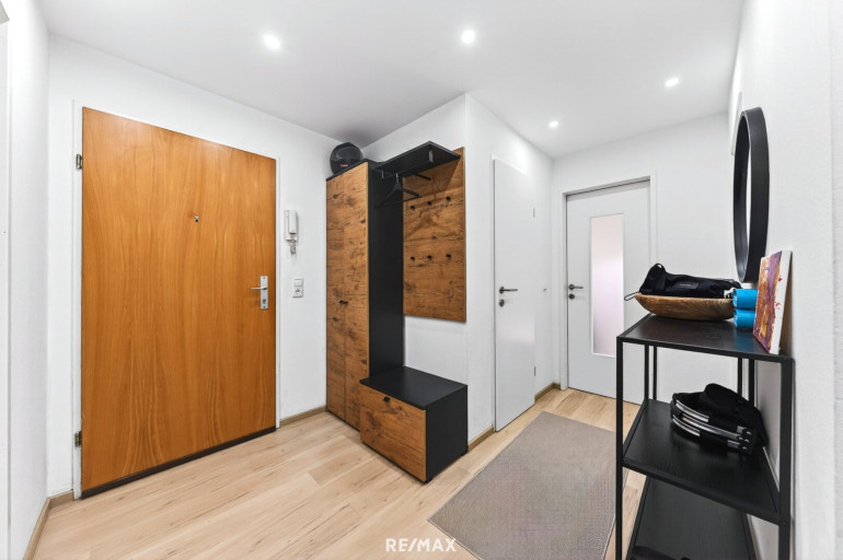 Beim Betreten der Wohnung werden Sie von einem einladenden Eingangsbereich empfangen. Die Garderobe in edler Holz-Schwarz-Optik setzt bereits hier ein klares Design-Statement und bietet praktischen Stauraum. Von hier aus verteilen sich die Räumlichkeiten sternförmig: Das Herzstück bildet die helle Wohnküche welche man jedoch wie am Plan zu sehen ist, trennen könnte. Die beiden großzügig geschnittenen Schlafzimmer bieten viel Platz für individuelle Gestaltungsmöglichkeiten und überzeugen durch hochwertige Bodenbeläge in warmer Holzoptik.
