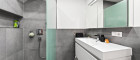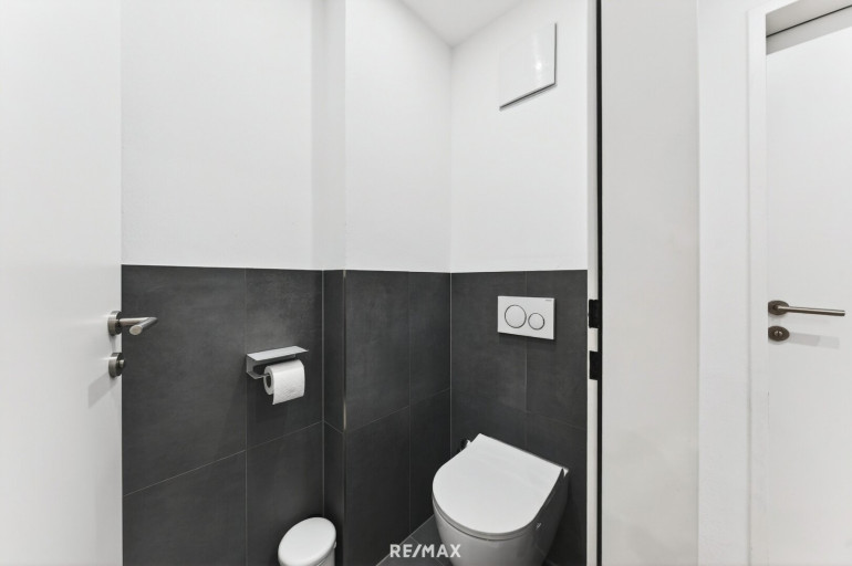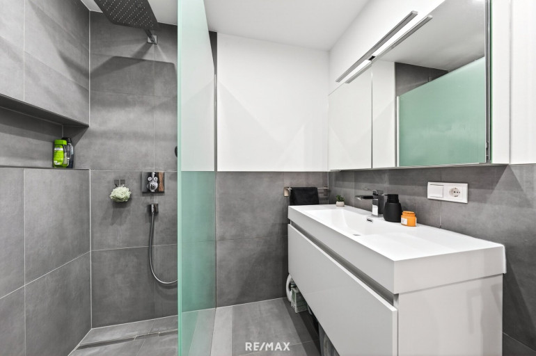 Ein wahres Highlight ist das modernisierte Badezimmer, das zur privaten Wellness-Oase wird. Es besticht durch großformatige, anthrazitfarbene Fliesen, eine bodentiefe Raindance-Dusche mit eleganter Glaswand sowie einen modernen Waschtisch mit viel Stauraum. Praktische Details wie ein integrierter Waschmaschinenanschluss sowie ein separates WC und ein eigener Abstellraum runden das durchdachte Raumkonzept ab.