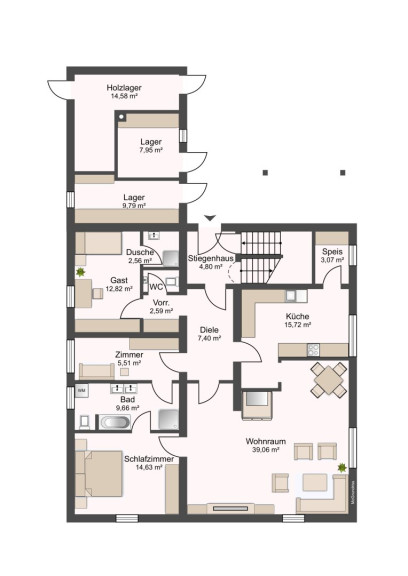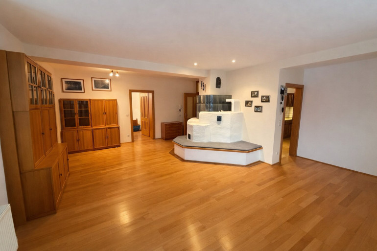 Drei Schlafzimmer, ein offener Wohnbereich mit Kachelofen, Küche mit Speis sowie Terrasse und Garten sorgen für ein stimmiges Wohnkonzept.