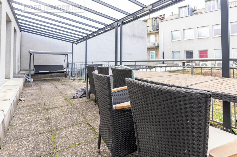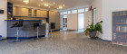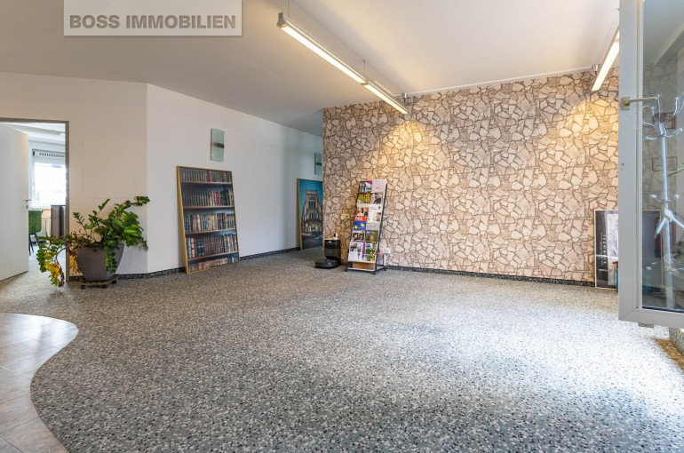 Schon beim Eintreten empfängt Sie ein weitläufiger Empfangsbereich – ideal, um Kundinnen und Kunden stilvoll willkommen zu heißen. Von hier aus gelangen Sie zentral in alle weiteren Räume sowie auf die überdachte Terrasse, die zusätzlichen Freiraum bietet.