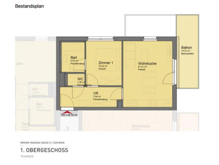das im Frühjahr 2020 fertiggestellte Wohnhaus in der Miriam-Makeba-Gasse 5 bietet zeitgemäßen Wohnkomfort in einer beliebten Wohngegend des 22. Bezirks. Die hier angebotene Wohnung liegt im 1. Stock eines Neubaus in einer gefragten Wohngegend. Die modern ausgestattete Wohnung verfügt über ca. 45 m2 Wohnfläche sowie einen Balkon.
