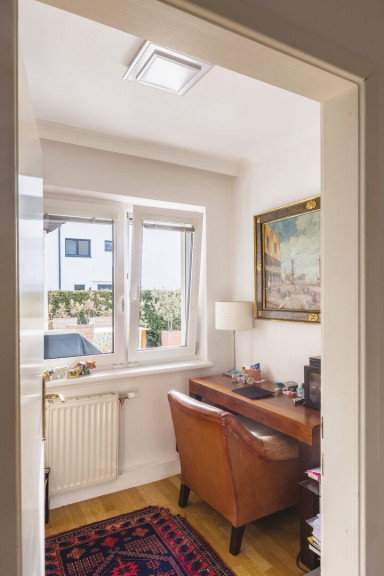 Das Haus wurde im Jahr 2019 umfassend und mit viel Sorgfalt saniert, wodurch es sich heute in einem äußerst ansprechenden Zustand präsentiert. Herzstück der Immobilie ist das großzügige Wohnzimmer, das viel Platz für gemütliches Beisammensein bietet und einen direkten Zugang zur Terrasse bietet. Ergänzt wird der Wohnbereich durch eine Küche mit integriertem Essplatz. Zwei gut geschnittene Schlafzimmer sowie ein zusätzliches Büro mit ca. 4,5 m² ermöglichen flexible Nutzungsmöglichkeiten.