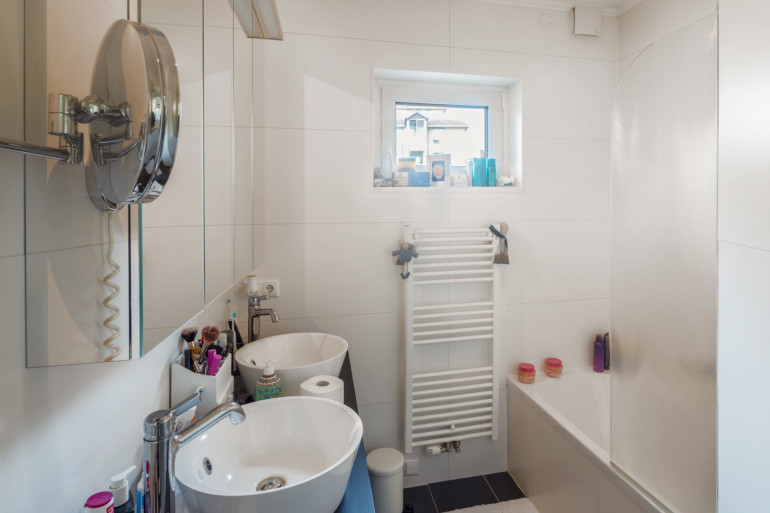 Das Badezimmer ist modern ausgestattet und verfügt über eine Badewanne und zwei Waschbecken. Beheizt wird die Liegenschaft mittels Gasheizung.