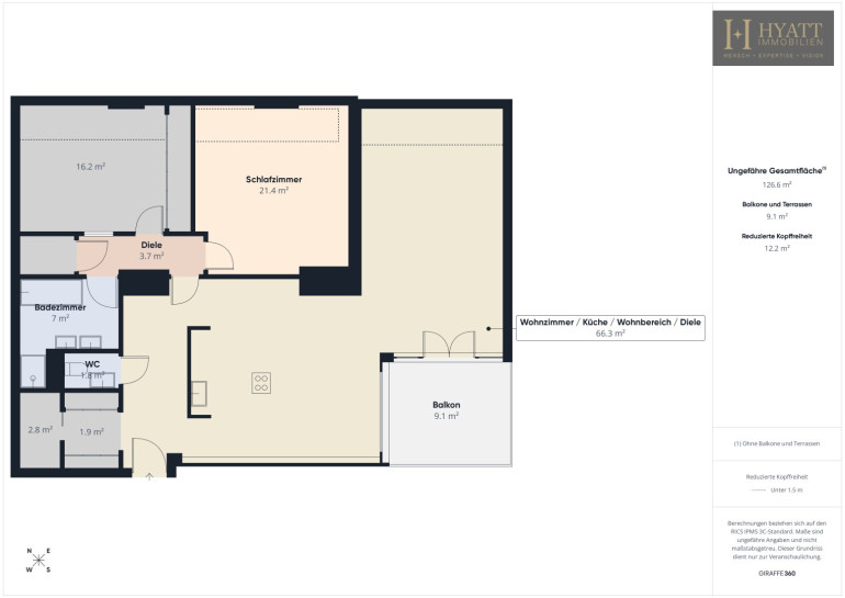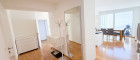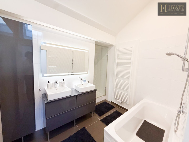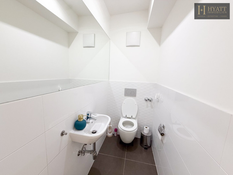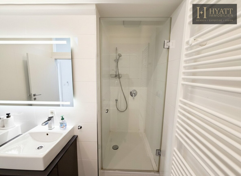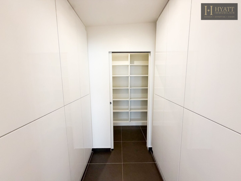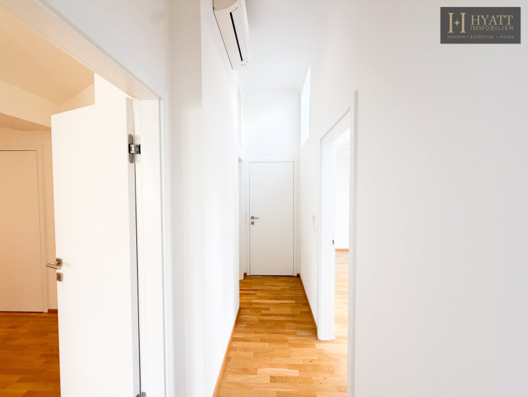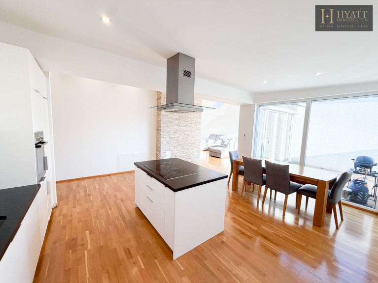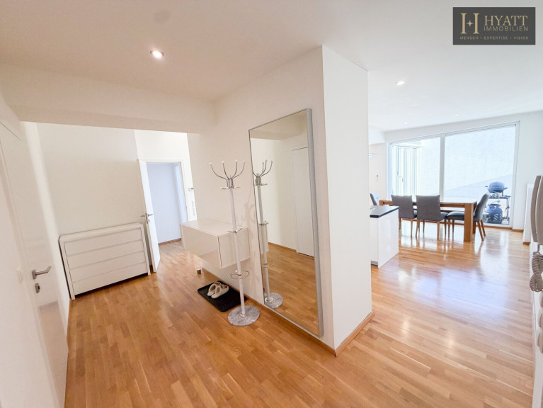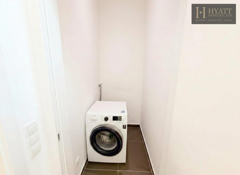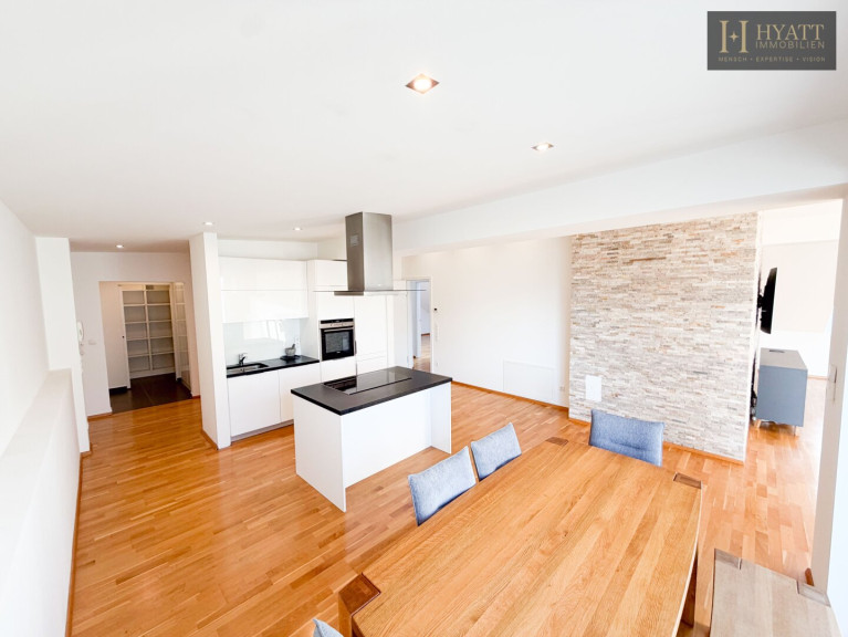 Vom Wohnbereich gelangt man zur Terrasse – eine Erweiterung ist in Aussicht gestellt, jedoch aktuell noch nicht genehmigt. Die hochwertig ausgestattete Wohnung verfügt über Fernwärme mit Fußbodenheizung, eine integrierte Klimaanlage (DAIKIN) sowie ein Smart-Home-System zur Steuerung von Licht, Beschattung, Heizung und Raumklima.