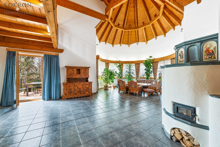 - Wohnzimmer mit Turmausbildung und Kachelofen, Sonnenterrasse mit Markise