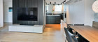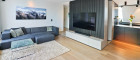 Der großzügige Wohnbereich bildet das Herzstück der Wohnung und verbindet sich nahtlos mit der maßgefertigten Designküche, ausgestattet mit Gaggenau- und Miele-Geräten sowie einer tiefschwarzen Granit-Arbeitsplatte Nero Assoluto. Von hier aus gelangt man direkt auf die rund 20 m² große Terrasse mit offenem Weitblick.
