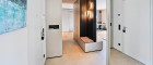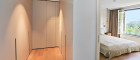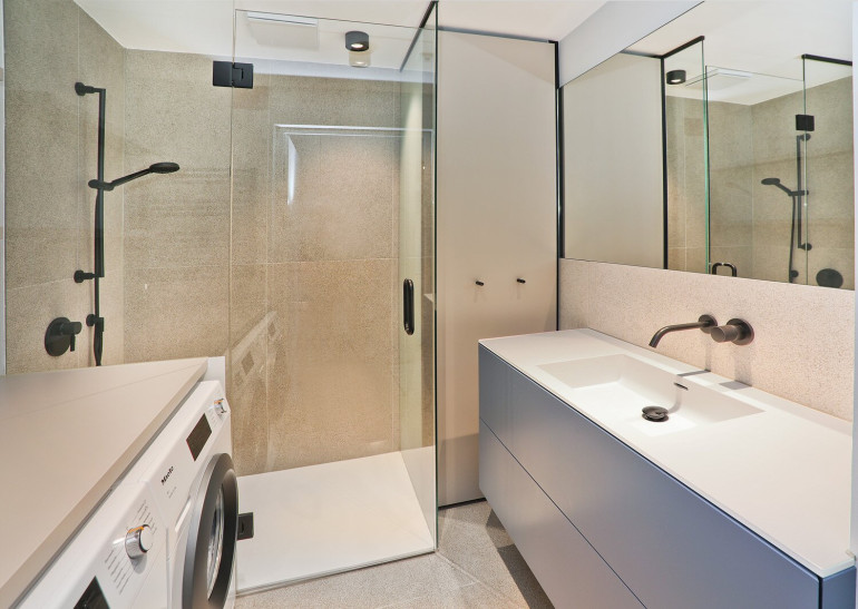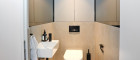 Der Elternbereich ist über eine dezent integrierte Pivot-Türe zugänglich und umfasst einen Schrankraum, ein Schlafzimmer sowie ein exklusiv ausgestattetes Badezimmer mit begehbarer Dusche und Badewanne. Auf der gegenüberliegenden Seite der Wohnung befinden sich zwei weitere Zimmer, ein Gäste-WC sowie ein zweites Badezimmer, wodurch eine klare und gut nutzbare Zonierung entsteht.
