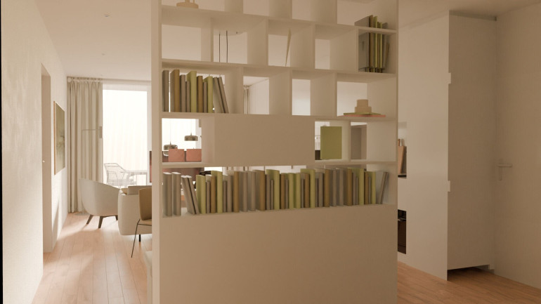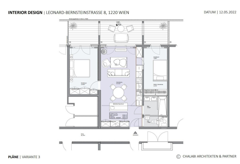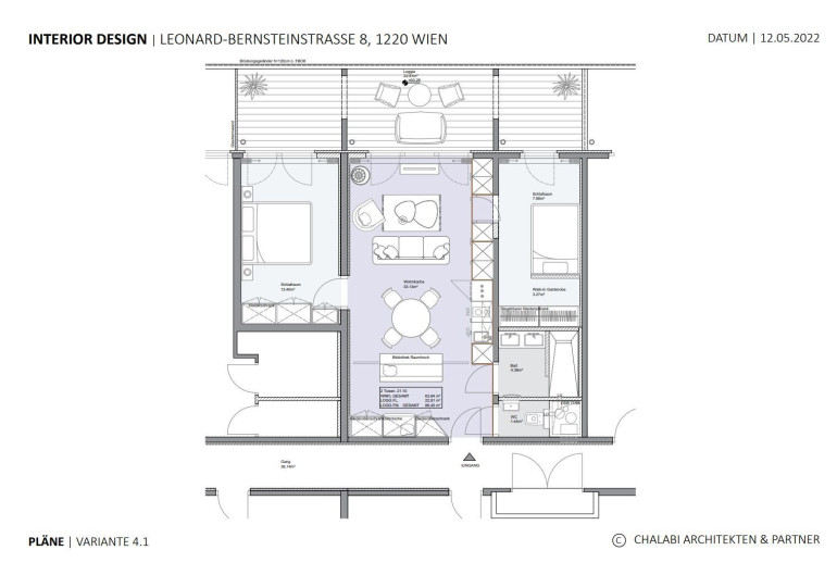 Unter den Bildern befinden sich einerseits Fotos und der Grundriss des Ist-Zustandes, sowie zwei alternative Grundriss-Varianten samt Visualisierungen, die zusätzliche Gestaltungsmöglichkeiten aufzeigen. Die alternativen Grundrisse zeigen die Wohnung als 3-Zimmer-Wohnung.