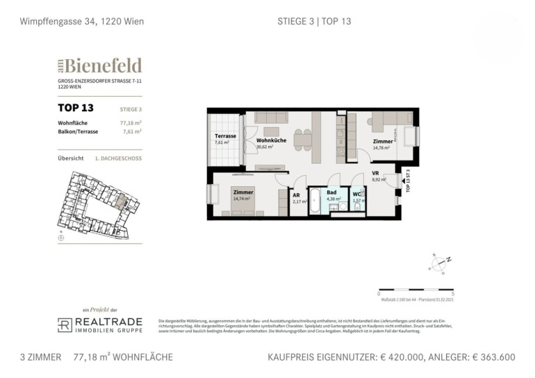Willkommen am Bienefeld – in der Groß-Enzersdorfer Straße 7–11 im 22. Wiener Gemeindebezirk entsteht eine moderne Wohnhausanlage mit 83 bereits bezugsfertigen Eigentumswohnungen. Jede Einheit überzeugt durch großzügige Freiflächen wie Balkone, Terrassen oder Eigengärten, die zum Verweilen im Freien einladen. Die klar strukturierte, zeitlose Architektur fügt sich harmonisch in die Umgebung ein und vermittelt gemeinsam mit der Auswahl hochwertiger, natürlicher Materialien ein Gefühl von Ruhe und Geborgenheit.Die Wohnungen bieten unterschiedliche Grundrisse und Wohnflächen und eignen sich so sowohl für Singles und Paare als auch für Familien. Besonderer Wert wurde auf Funktionalität und modernes Design gelegt: Eichenparkettböden von Weitzer, Fliesen von xclusiva ceramica in den Nassräumen, hochwertige Fenster von IBM Schober sowie Türen von DANA fügen sich zu einem stimmigen Gesamtbild. Ergänzt wird die Ausstattung durch Fußbodenheizung, dreifach verglaste Fenster und – in den Dachgeschoßen – Sonnenschutz und Klimavorbereitung.