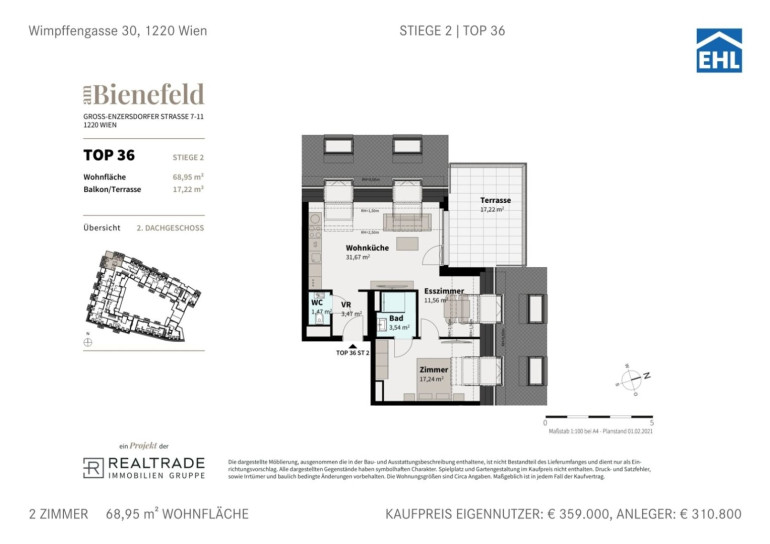 Willkommen am Bienefeld – in der Groß-Enzersdorfer Straße 7–11 im 22. Wiener Gemeindebezirk entsteht eine moderne Wohnhausanlage mit 83 bereits bezugsfertigen Eigentumswohnungen. Jede Einheit überzeugt durch großzügige Freiflächen wie Balkone, Terrassen oder Eigengärten, die zum Verweilen im Freien einladen. Die klar strukturierte, zeitlose Architektur fügt sich harmonisch in die Umgebung ein und vermittelt gemeinsam mit der Auswahl hochwertiger, natürlicher Materialien ein Gefühl von Ruhe und Geborgenheit.Die Wohnungen bieten unterschiedliche Grundrisse und Wohnflächen und eignen sich so sowohl für Singles und Paare als auch für Familien. Besonderer Wert wurde auf Funktionalität und modernes Design gelegt: Eichenparkettböden von Weitzer, Fliesen von xclusiva ceramica in den Nassräumen, hochwertige Fenster von IBM Schober sowie Türen von DANA fügen sich zu einem stimmigen Gesamtbild. Ergänzt wird die Ausstattung durch Fußbodenheizung, dreifach verglaste Fenster und – in den Dachgeschoßen – Sonnenschutz und Klimavorbereitung.
