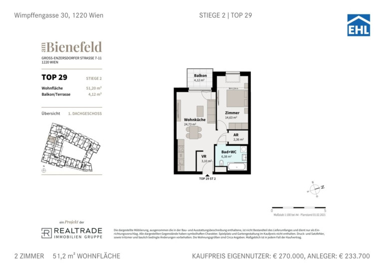 Willkommen am Bienefeld – in der Groß-Enzersdorfer Straße 7–11 im 22. Wiener Gemeindebezirk entsteht eine moderne Wohnhausanlage mit 83 bereits bezugsfertigen Eigentumswohnungen. Jede Einheit überzeugt durch großzügige Freiflächen wie Balkone, Terrassen oder Eigengärten, die zum Verweilen im Freien einladen. Die klar strukturierte, zeitlose Architektur fügt sich harmonisch in die Umgebung ein und vermittelt gemeinsam mit der Auswahl hochwertiger, natürlicher Materialien ein Gefühl von Ruhe und Geborgenheit.Die Wohnungen bieten unterschiedliche Grundrisse und Wohnflächen und eignen sich so sowohl für Singles und Paare als auch für Familien. Besonderer Wert wurde auf Funktionalität und modernes Design gelegt: Eichenparkettböden von Weitzer, Fliesen von xclusiva ceramica in den Nassräumen, hochwertige Fenster von IBM Schober sowie Türen von DANA fügen sich zu einem stimmigen Gesamtbild. Ergänzt wird die Ausstattung durch Fußbodenheizung, dreifach verglaste Fenster und – in den Dachgeschoßen – Sonnenschutz und Klimavorbereitung.