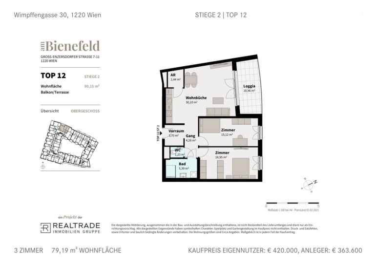 Willkommen am Bienefeld – in der Groß-Enzersdorfer Straße 7–11 im 22. Wiener Gemeindebezirk entsteht eine moderne Wohnhausanlage mit 83 bereits bezugsfertigen Eigentumswohnungen. Jede Einheit überzeugt durch großzügige Freiflächen wie Balkone, Terrassen oder Eigengärten, die zum Verweilen im Freien einladen. Die klar strukturierte, zeitlose Architektur fügt sich harmonisch in die Umgebung ein und vermittelt gemeinsam mit der Auswahl hochwertiger, natürlicher Materialien ein Gefühl von Ruhe und Geborgenheit.Die Wohnungen bieten unterschiedliche Grundrisse und Wohnflächen und eignen sich so sowohl für Singles und Paare als auch für Familien. Besonderer Wert wurde auf Funktionalität und modernes Design gelegt: Eichenparkettböden von Weitzer, Fliesen von xclusiva ceramica in den Nassräumen, hochwertige Fenster von IBM Schober sowie Türen von DANA fügen sich zu einem stimmigen Gesamtbild. Ergänzt wird die Ausstattung durch Fußbodenheizung, dreifach verglaste Fenster und – in den Dachgeschoßen – Sonnenschutz und Klimavorbereitung.