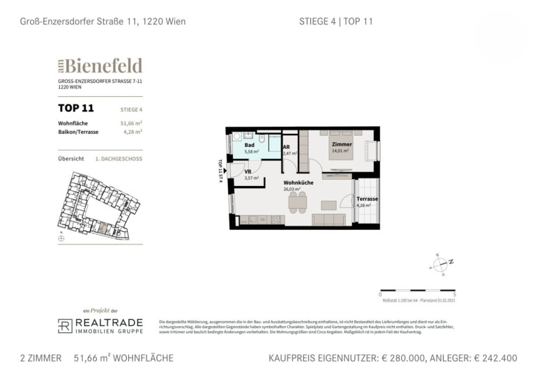 Willkommen am Bienefeld – in der Groß-Enzersdorfer Straße 7–11 im 22. Wiener Gemeindebezirk entsteht eine moderne Wohnhausanlage mit 83 bereits bezugsfertigen Eigentumswohnungen. Jede Einheit überzeugt durch großzügige Freiflächen wie Balkone, Terrassen oder Eigengärten, die zum Verweilen im Freien einladen. Die klar strukturierte, zeitlose Architektur fügt sich harmonisch in die Umgebung ein und vermittelt gemeinsam mit der Auswahl hochwertiger, natürlicher Materialien ein Gefühl von Ruhe und Geborgenheit.Die Wohnungen bieten unterschiedliche Grundrisse und Wohnflächen und eignen sich so sowohl für Singles und Paare als auch für Familien. Besonderer Wert wurde auf Funktionalität und modernes Design gelegt: Eichenparkettböden von Weitzer, Fliesen von xclusiva ceramica in den Nassräumen, hochwertige Fenster von IBM Schober sowie Türen von DANA fügen sich zu einem stimmigen Gesamtbild. Ergänzt wird die Ausstattung durch Fußbodenheizung, dreifach verglaste Fenster und – in den Dachgeschoßen – Sonnenschutz und Klimavorbereitung.
