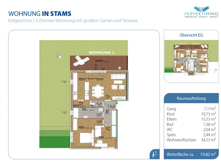 In familienfreundlicher Lage im Ortsteil Thannrain bei Stams präsentiert sich diese hochwertige 3-Zimmer-Wohnung als ideales Zuhause für Familien, die naturnahes Wohnen mit moderner Bauweise und durchdachter Raumaufteilung verbinden möchten. Eingebettet in eine attraktive Kleinwohnanlage überzeugt die Immobilie durch ihre ruhige Lage, ihre hochwertige Ausstattung sowie ein stimmiges Gesamtkonzept, das auch Lebensqualität in den Mittelpunkt stellt. Hier wohnen Sie in einer Umgebung, die Kindern Raum zum Aufwachsen bietet und gleichzeitig Eltern durch kurze Wege und eine angenehme Wohnatmosphäre den Alltag erleichtert. Die Wohnung verfügt über eine Wohnfläche von rund 79,82 m² sowie eine Gartenfläche von etwa 119,18 m² und bietet damit ausreichend Platz für das Familienleben mit individuellen Rückzugsorten für jedes Familienmitglied. Besonders hervorzuheben ist die großzügige Terrasse mit rund 20,02 m² Fläche, die zusätzlichen Freiraum im Alltag schafft und zu gemeinsamen Mahlzeiten im Freien, entspannten Nachmittagen mit den Kindern oder gemütlichen Sommerabenden mit Freunden einlädt. Durch die durchdachte Ausrichtung profitieren Sie hier von viel Sonne und einer angenehmen Wohnatmosphäre über den gesamten Tagesverlauf hinweg.
