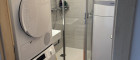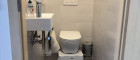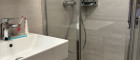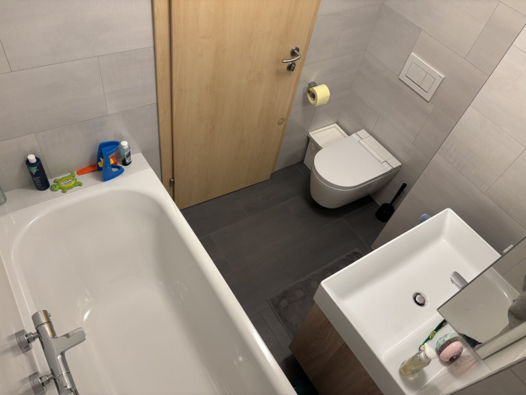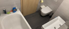 The apartment features two bathrooms, one with a bathtub and one with a shower, as well as two separate toilets.