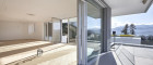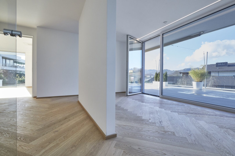 Die raumhohen Holz-Alu-Fenster mit Dreifachverglasung sorgen für optimale Wärmedämmung. Durch das minimale Gewicht lassen sich die Türen mit nur einer Hand bedienen. Entlang der gesamten Fenster des Wohnbereichs, Master Bedrooms und Schlafzimmers befinden sich deckenintegrierte Vorhangschienen, welche von inderektem Mood Lighting beleuchtet werden.