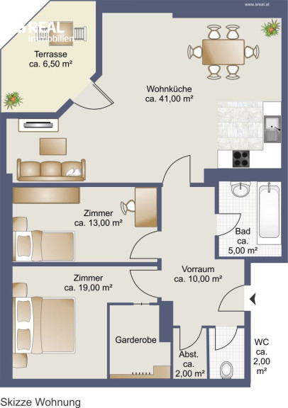 Die gute Raumaufteilung und nicht einsehbarer Eckterrasse bieten einen 3 Personenhaushalt ausreichend Platz. Zu den Dachwohnungen gibt es keine Kellerabteile. Alle Zimmer und Nebenräume wie Abstellraum, WC und Bad sind über das Vorzimmer getrennt begehbar.